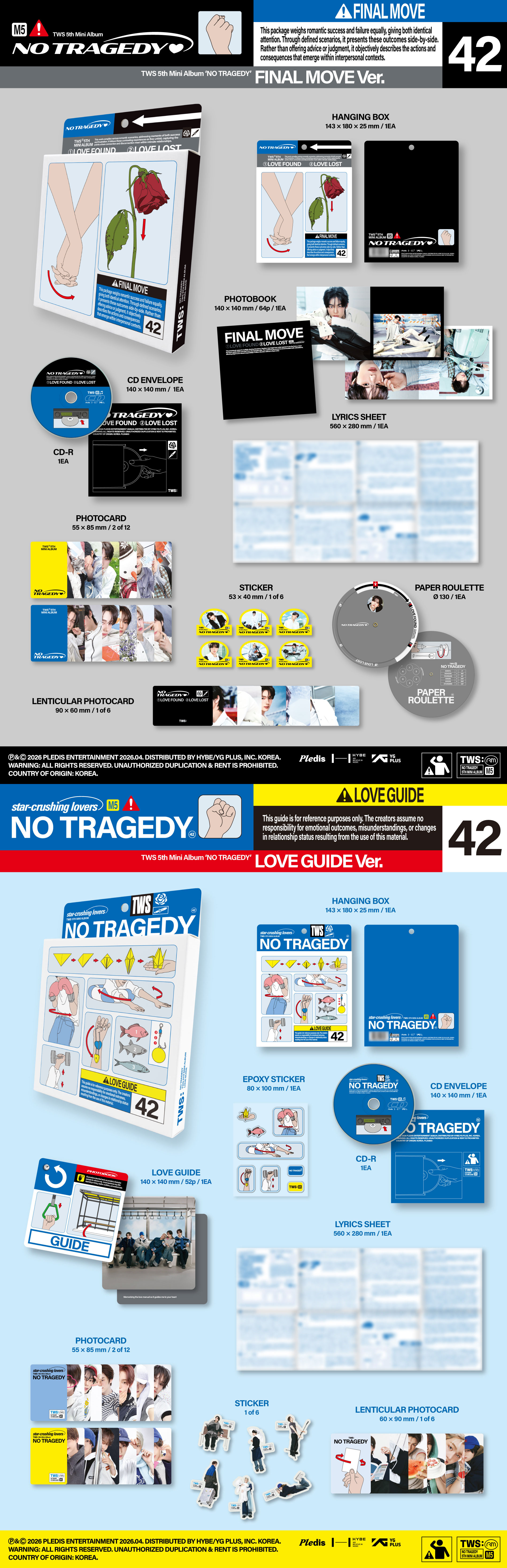 [MOVIMIENTO FINAL Ver.]-CAJA PARA COLGAR: 1 tipo / W143-PHOTOBOOK: 1 tipo / W140-HOJA DE LETRAS: 1 tipo / W560-RULETA DE PAPEL: 1 tipo / W130-STICKER: Inserción aleatoria de 1 tipo de 6 tipos para cada versión / W53-PHOTOCARD: Inserción aleatoria de 2 tipos de 12 tipos en cada versión / W55(mm)-LENTICULAR PHOTOCARD: Inserción aleatoria de 1 tipo de 6 tipos en cada versión /W90 X H60 (mm)-SOBRE CD: 1 tipo / W140-CD-R: 1 tipo/W120 [GUÍA DEL AMOR Ver.] -CAJA PARA COLGAR: 1 tipo / W143 -GUÍA DEL AMOR: 1 tipo / W140 -HOJA DE LETRAS: 1 tipo / W560 -EPOXI STICKER: 1 tipo / W80 -STICKER: 1 tipo insertado aleatoriamente de 6 tipos en cada versión -PHOTOCARD: Inserción aleatoria de 2 tipos de 12 tipos para cada versión / W55 -LENTICULAR PHOTOCARD: Inserción aleatoria de 1 tipo de 6 tipos para cada versión / W60 -SOBRE CD: 1 tipo / W140